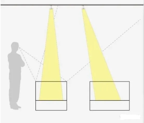 在观众观看展品的视场内,不应有来自光源或窗户的直接眩光或来自各种表面的反射眩光。对于灯具在展品上形成的一次反射眩光,可以将灯具安装在无反射干扰的布灯区进行消除。